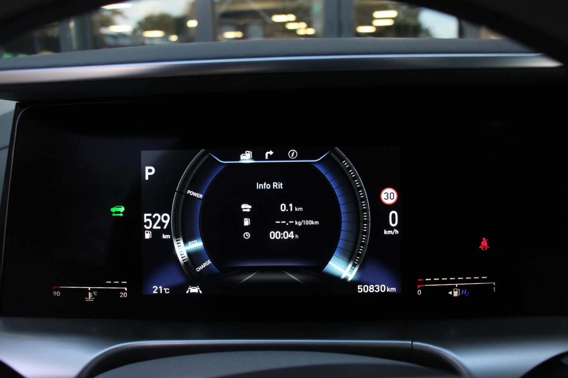 Zoals u mag verwachten van deze Hyundai NEXO is hij uitgerust met een reeks aan actieve veiligheidssystemen. Tijdens de rit hebt u altijd een bijrijder, want de verkeersbord-detectie leest de borden langs de weg en projecteert ze voor u op het instrumentarium. Het Lane-keeping systeem zorgt dat u mooi binnen de lijntjes blijft. Ongemerkt buiten de rijstrook komen is er niet meer bij. In een noodsituatie waarschuwt forward collision warning bij een dreigende aanrijding met een voorligger. De veiligheid van deze auto wordt verder verhoogd door dodehoekdetectie, hill hold functie, vermoeidheidsherkenning, autonoom remsysteem en bandenspanningcontrolesysteem.