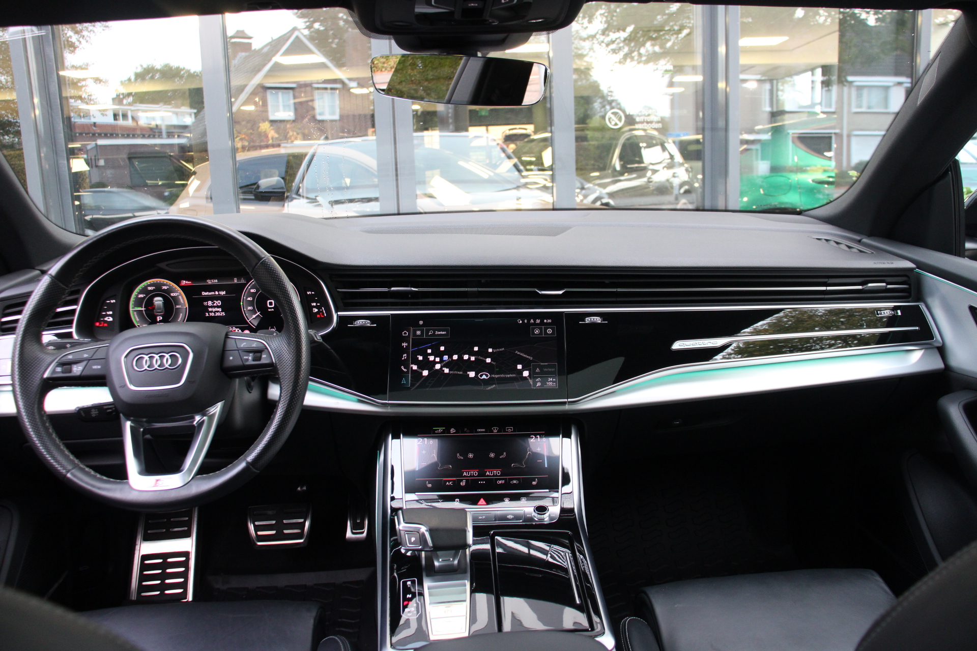 Snelheid, brandstofinfo, noem maar op. Het digitale dashboard houdt u permanent op de hoogte. Goed en overzichtelijk. Het gebruik van de 360 graden camera op deze auto zorgt voor een groter gezichtsveld en helpt de dode hoeken te elimineren. Adaptive cruise control houdt de ingestelde snelheid vast en houdt afstand tot het voertuig voor u. Rijden-stilstaan, rijden-stilstaan. Niks is irritanter en vermoeiender dan filerijden. Daar heeft deze Audi Q8 een oplossing voor: de file assistent, die met radarmeting permanent het tempo aanpast op de voorligger. Zelfs als die stopt. Via uw smartphone en Connected Services checkt u eenvoudig de belangrijke functies van de auto, overal en altijd. Extra opties op deze auto zijn: Bang & Olufsen sound system, full map navigatiesysteem, WIFI-hotspot, kruisend verkeer detectie, electronic climate control en schakelpaddles aan het stuur.