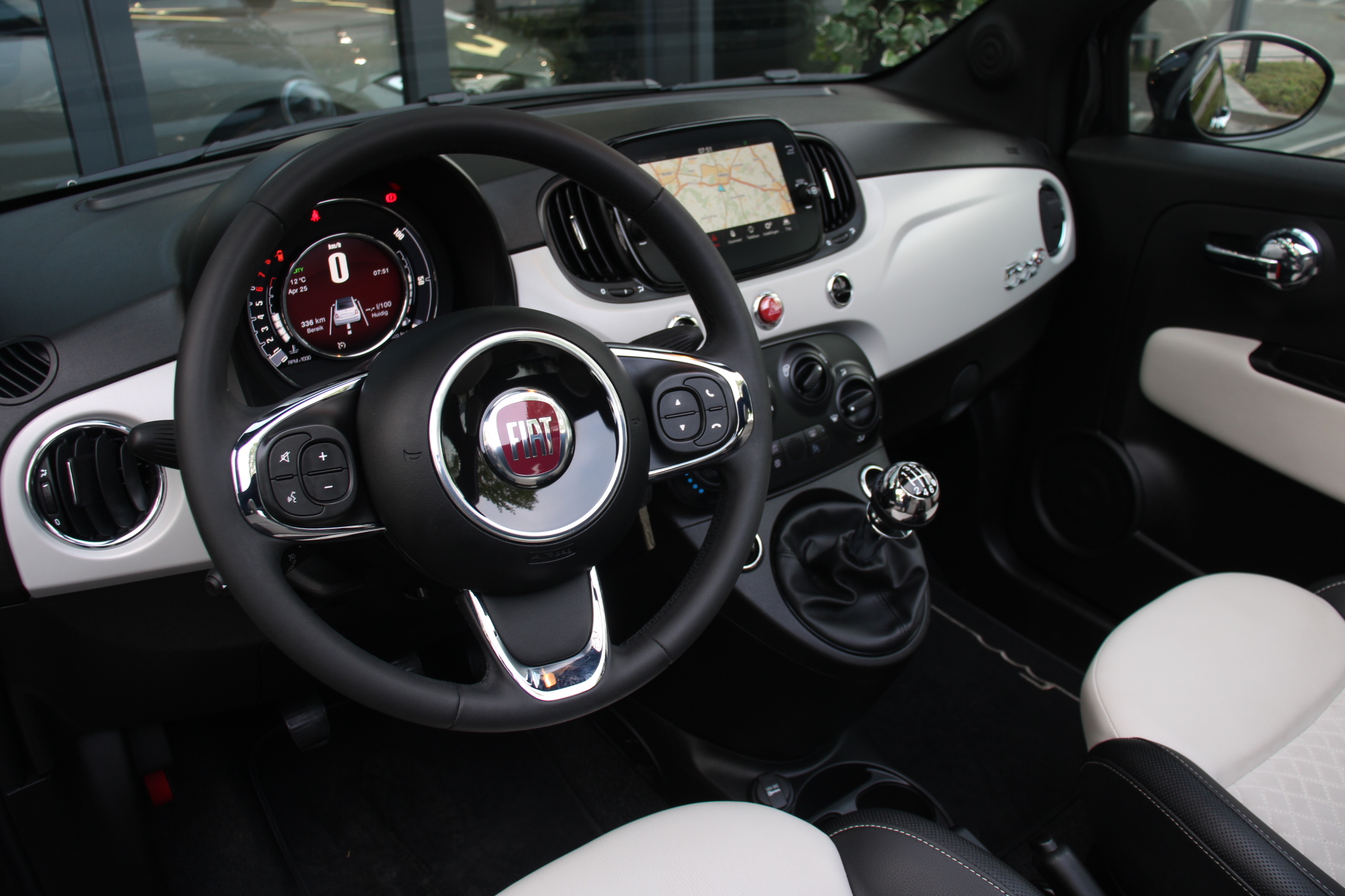 De bediening van het audiosysteem en het navigatiesysteem gebeurt met knoppen op het stuur. De audio is overigens voorzien van DAB-radio voor een altijd heldere ontvangst. Onbedoeld snijden na het inhalen gebeurt niet meer, dankzij de achteropkomend verkeer waarschuwing. Met de hulp van de parkeersensoren kost inparkeren en uitparkeren u geen enkele moeite. De cruise control zorgt voor een mooie, gelijkmatige snelheid die u zelf instelt. Dat is relaxt! Natuurlijk heeft deze auto ook airconditioning. Met lederen stuur en centrale deurvergrendeling met afstandsbediening is deze Fiat helemaal compleet.